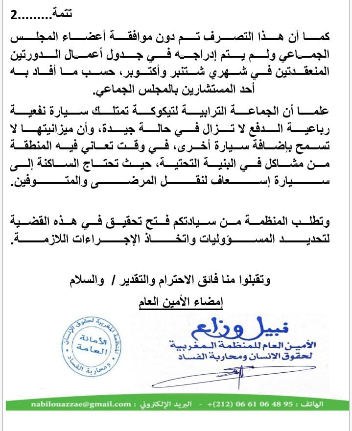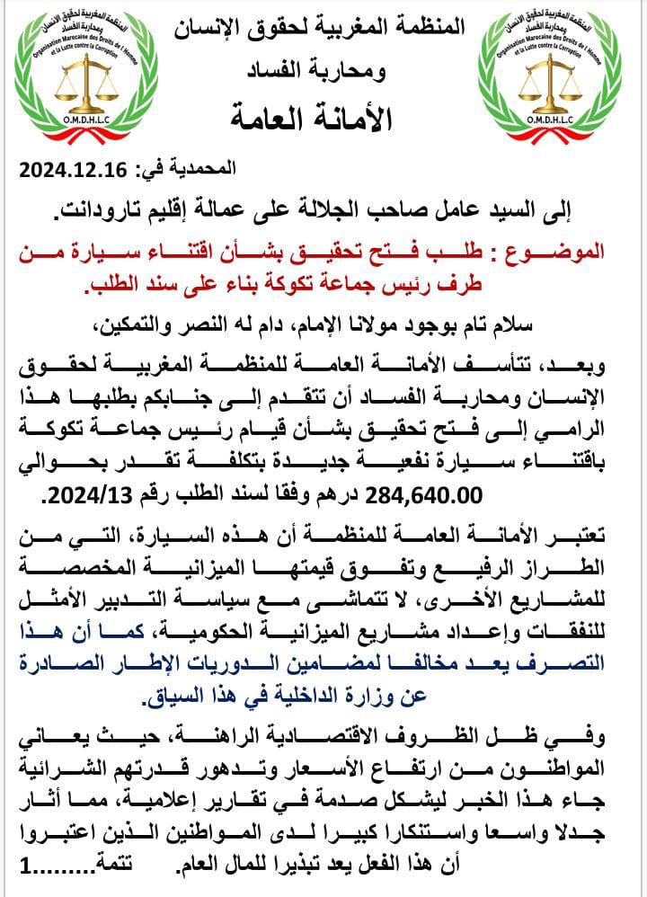 *سلام تام بوجود مولانا الإمام، دام له النصر والتمكين،وبعد، تتأسف الأمانة العامة للمنظمة المغربية لحقوق الإنسان ومحاربة الفساد أن تتقدم إلى جنابكم بطلبها هذا، الرامي إلى فتح تحقيق بشأن قيام رئيس جماعة تكوكة باقتناء سيارة نفعية جديدة بتكلفة تقدر بحوالي 284,640.00 درهم وفقا لسند الطلب رقم 13/2024.
