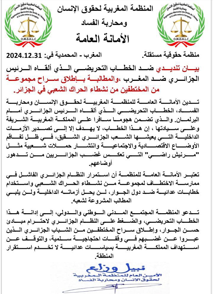 تدين الأمانة العامة للمنظمة المغربية لحقوق الإنسان ومحاربة الفساد، الخطاب التحريضي الذي ألقاه الرئيس الجزائري أمام البرلمان. والذي تضمن هجوما سافرا على المملكة المغربية الشريفة وعلى سيادتها.