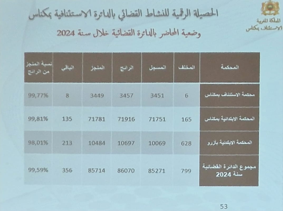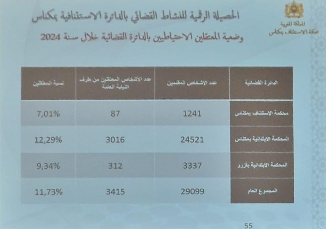 شهدت المراسيم حضور عدد من الشخصيات البارزة على رأسها عامل عمالة مكناس،و ترأس الجلسة الافتتاحية الرئيس الأول لمحكمة الاستئناف بمكناس، الأستاذ محمد الضاوي ، كما أعطى الوكيل العام للملك بمحكمة الإستئناف، فهمي بوزيان ،كلمة استعرض خلالها حصيلة السنة القضائية المنصرمة 2024 .