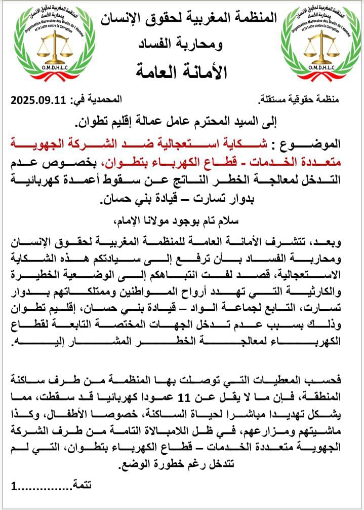 *سلام تام بوجود مولانا الإمام،وبعد، تتشرف الأمانة العامة للمنظمة المغربية لحقوق الإنسان ومحاربة الفساد بأن ترفع إلى سيادتكم هذه الشكاية الاستعجالية، قصد لفت انتباهكم إلى الوضعية الخطيرة والكارثية التي تهدد أرواح المواطنين وممتلكاتهم بدوار تسارت، التابع لجماعة الواد – قيادة بني حسان، إقليم تطوان، وذلك بسبب عدم تدخل الجهات المختصة التابعة لقطاع الكهرباء لمعالجة الخطر المشار إليه.