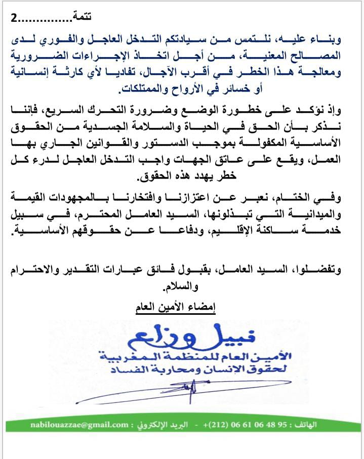 *وفي الختام، نعبر عن اعتزازنا وافتخارنا بالمجهودات القيمة والميدانية التي تبذلونها، السيد العامل المحترم، في سبيل خدمة ساكنة الإقليم، ودفاعا عن حقوقهم الأساسية.وتفضلوا، السيد العامل، بقبول فائق عبارات التقدير والاحترام والسلام.