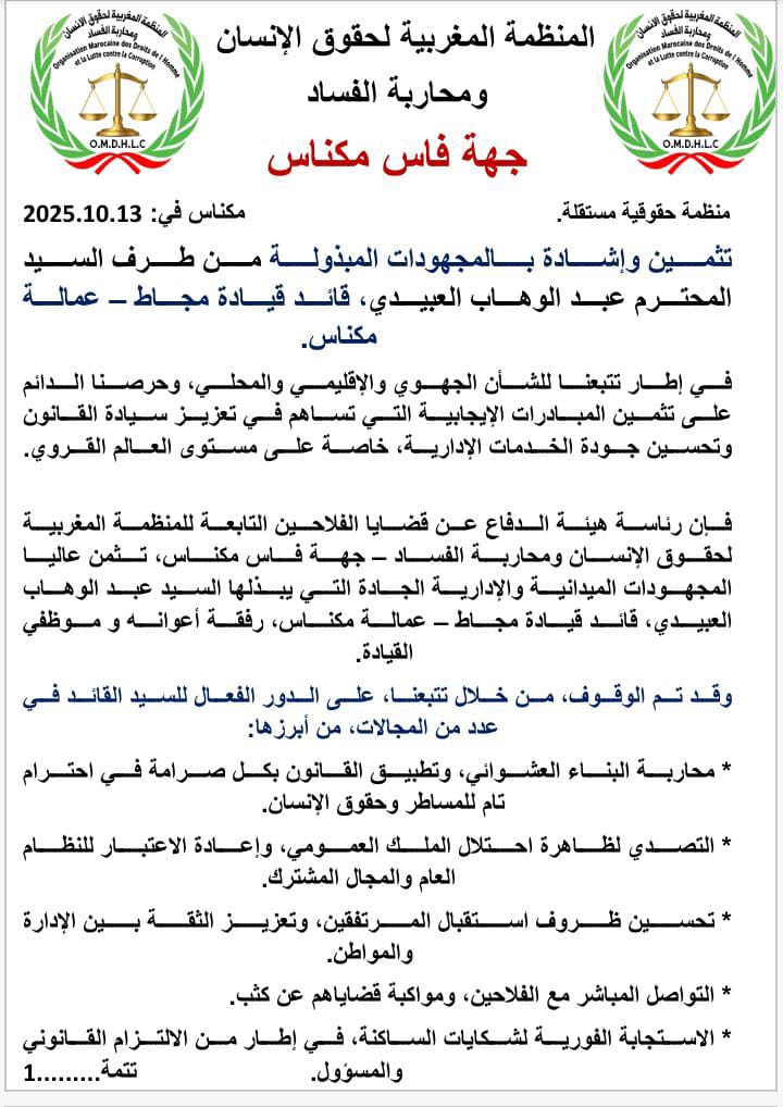 فإن رئاسة هيئة الدفاع عن قضايا الفلاحين التابعة للمنظمة المغربية لحقوق الإنسان ومحاربة الفساد – جهة فاس مكناس، تثمن عاليا المجهودات الميدانية والإدارية الجادة التي يبذلها السيد عبد الوهاب العبيدي، قائد قيادة مجاط – عمالة مكناس، رفقة أعوانه و موظفي القيادة.