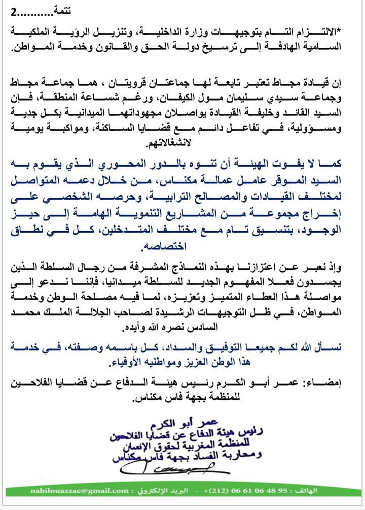 إمضاء: عمر أبو الكرم رئيس هيئة الدفاع عن قضايا الفلاحين للمنظمة بجهة فاس مكناس.