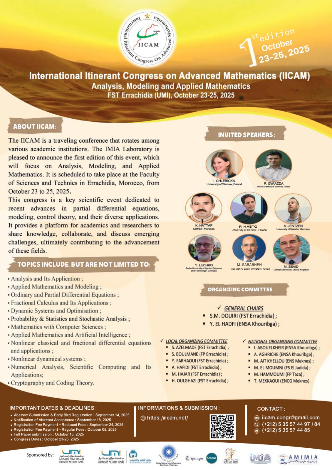 في إطار البرنامج السنوي للأنشطة العلمية لكلية العلوم والتقنيات بالرشيدية التابعة لجامعة مولاي إسماعيل برسم السنة الجامعية 2025/2026، ينظم مختبر IMIA (المعلوميات، الرياضيات والذكاء الاصطناعي) بشعبة الرياضيات بالكلية المذكورة، الدورة الأولى من المؤتمر الدولي المتنقل في الرياضيات المتقدمة (IICAM’2025)، تحت شعار»: التحليل، النمذجة والرياضيات التطبيقية «، وذلك خلال الفترة الممتدة من 23 إلى 25 أكتوبر 2025 بمدينة الرشيدية.
