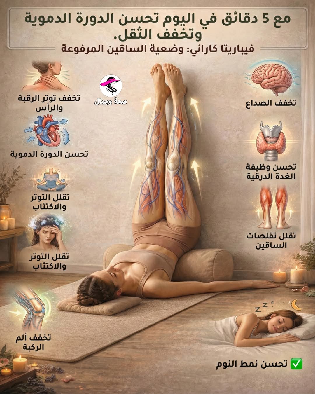 رفع الساقين يسهل عودة الدم إلى القلب، مما يساعد في تخفيف الشعور بالثقل والتعب في الساقين.
