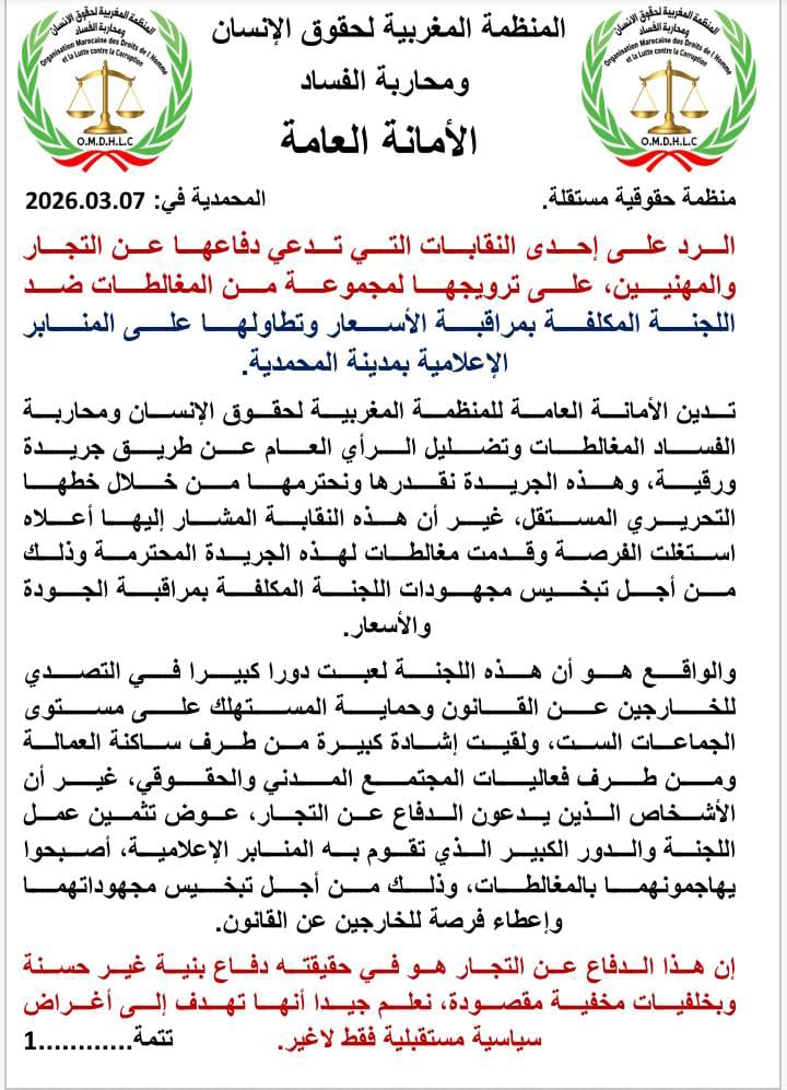 تدين الأمانة العامة للمنظمة المغربية لحقوق الإنسان ومحاربة الفساد المغالطات وتضليل الرأي العام عن طريق جريدة ورقية، وهذه الجريدة نقدرها ونحترمها من خلال خطها التحريري المستقل، غير أن هذه النقابة المشار إليها أعلاه استغلت الفرصة وقدمت مغالطات لهذه الجريدة المحترمة، وذلك من أجل تبخيس مجهودات اللجنة المكلفة بمراقبة الجودة والأسعار.