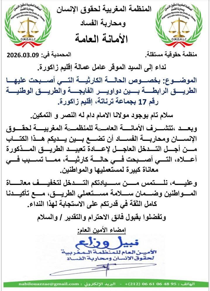 وبعد، تتشرف الأمانة العامة للمنظمة المغربية لحقوق الإنسان ومحاربة الفساد أن تضع بين يديكم هذا الكتاب، من أجل التدخل العاجل لإعادة تعبيد الطريق المذكورة أعلاه، التي أصبحت في حالة كارثية، مما تسبب في معاناة كبيرة لمستعمليها والمواطنين.